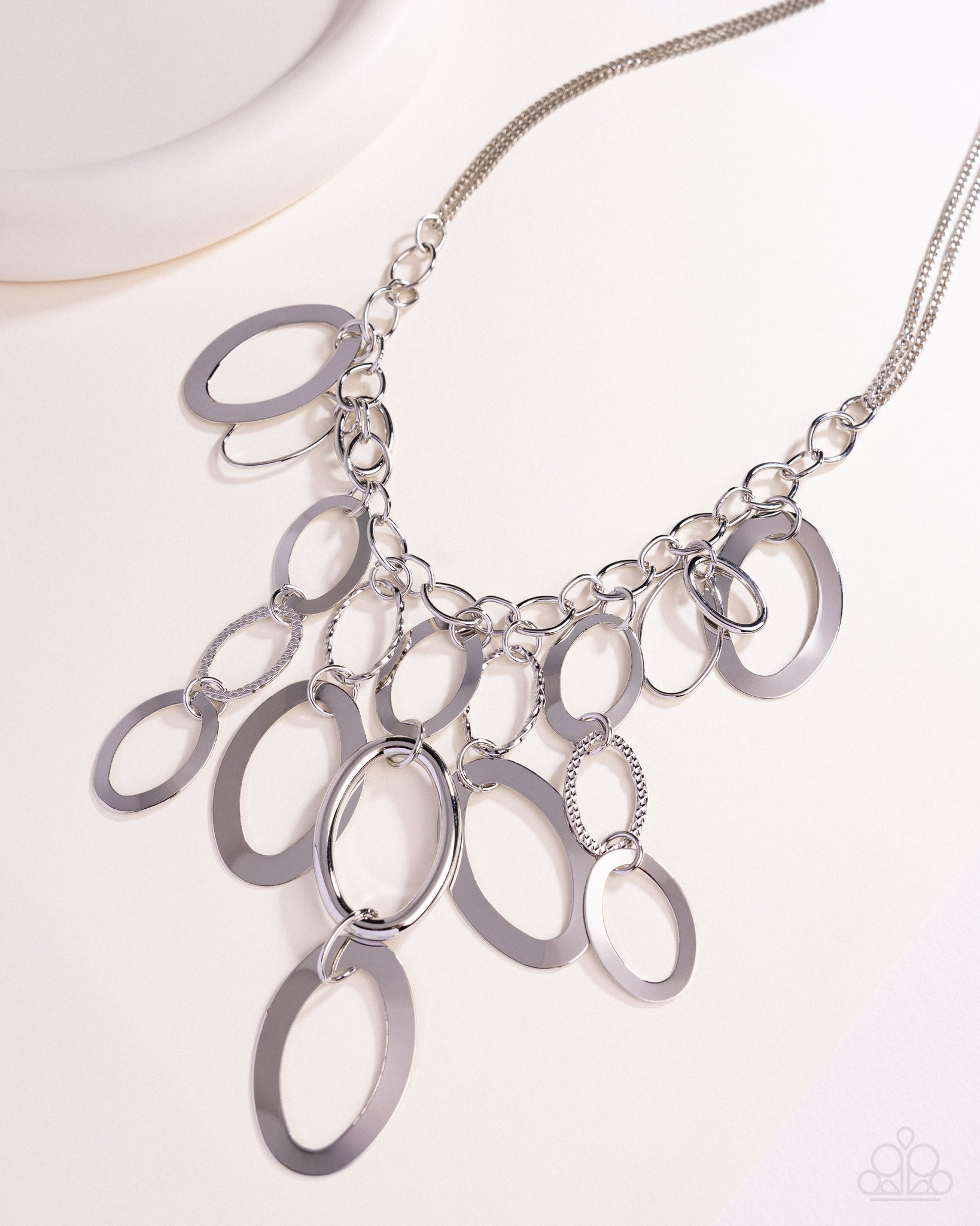 Featuring a variety of textures, varying sizes of flat, sleek, and hammered silver ovals cascade from a silver oval-like chain in free-falling layers, showcasing its eye-catching depth and drama below the collar. Features an adjustable clasp closure.