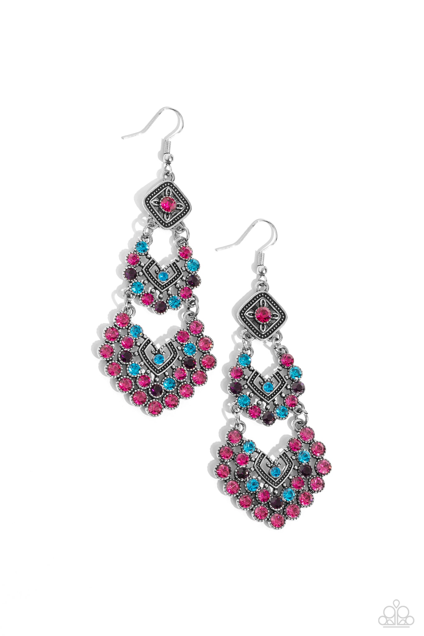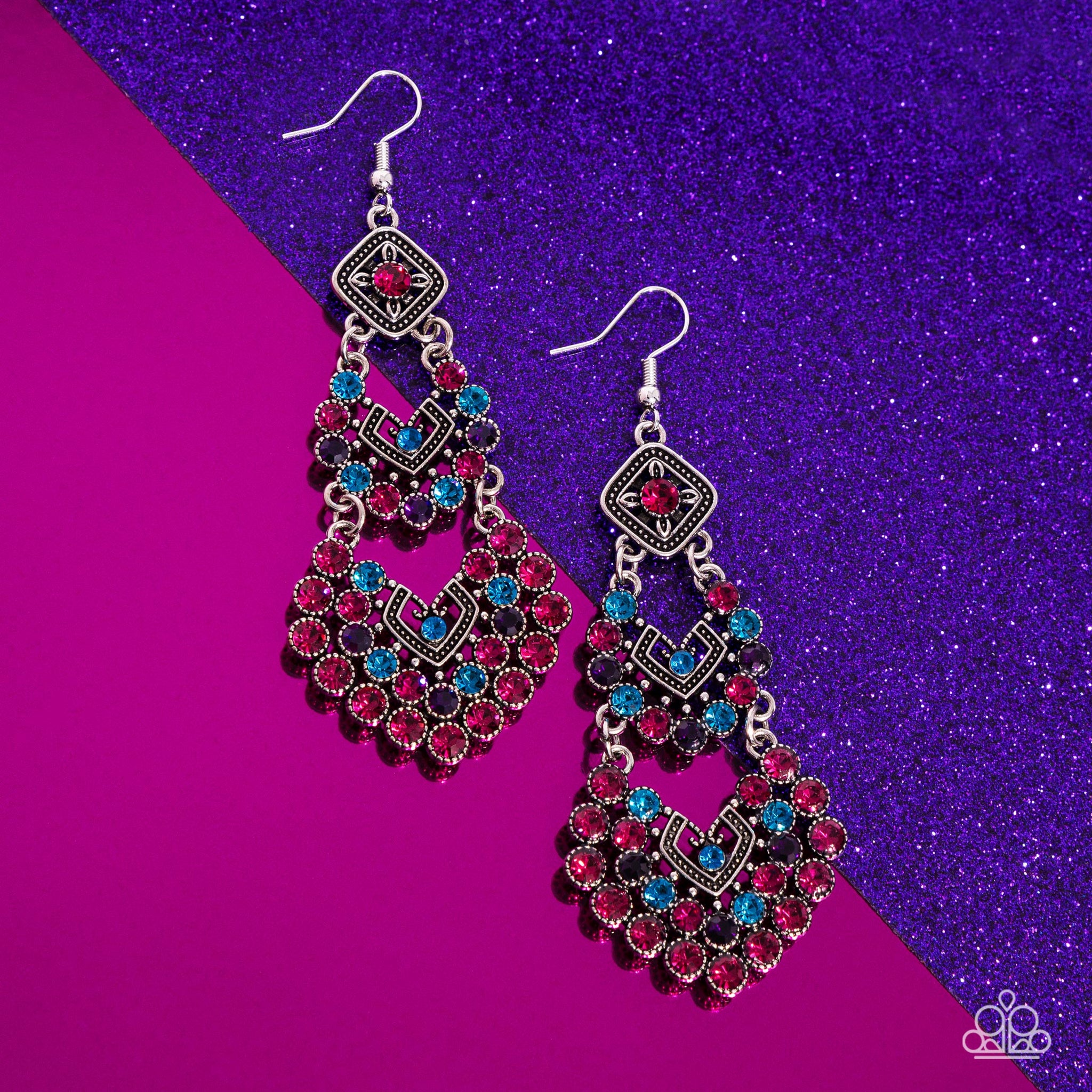 A glittery explosion of multicolored rhinestones coalesce into three sparkly frames that delicately link into a studded chandelier, creating a dramatic statement piece. Earring attaches to a standard fishhook fitting.