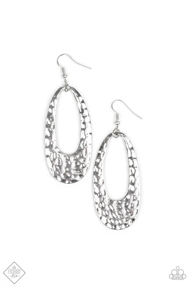 Delicately hammered in endless ripples of shimmer, an elongated oval silver hoop swings from the ear for an authentic artisan inspired look. Earring attaches to a standard fishhook fitting. Sold as one pair of earrings.