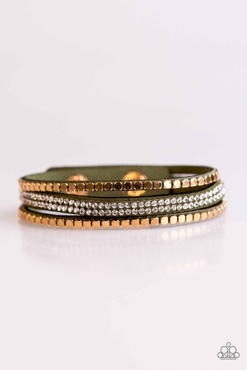 Rows of glistening gold cube beads and glittery white rhinestones are encrusted along skinny strands of green suede. The mismatched shimmer wraps around the wrist, creating a sassy look. Features an adjustable snap closure.