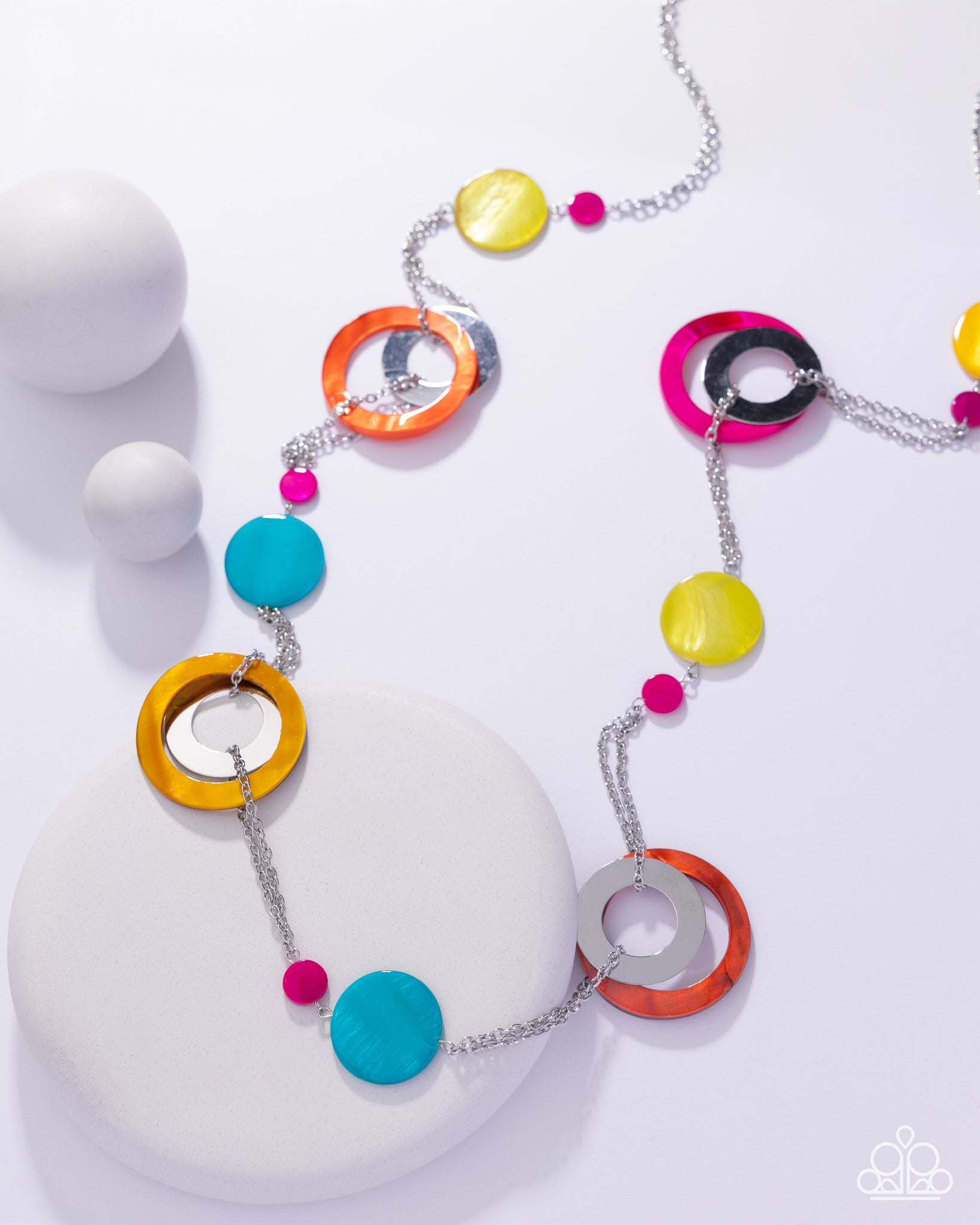 Infused along a double-layered, elongated silver chain, chunky brightly-colored shell discs with light-reflecting finishes join layers of metallic silver rings beside solitaire pink, blue, and yellow shells in varying sizes to create a retro-inspired display. Features an adjustable clasp closure.