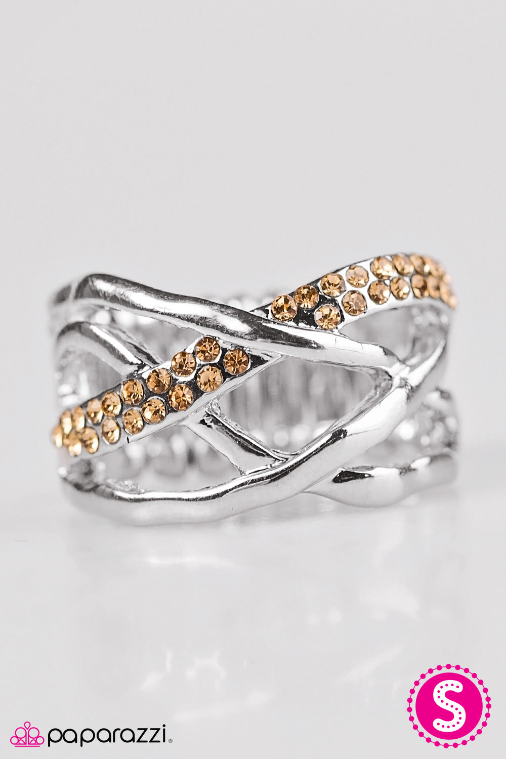 Delicately hammered silver bars weave across the finger, creating an airy band. Dazzling topaz rhinestones are sprinkled across one bar, adding a beautiful splash of color as the glistening bars braid into a refined band.