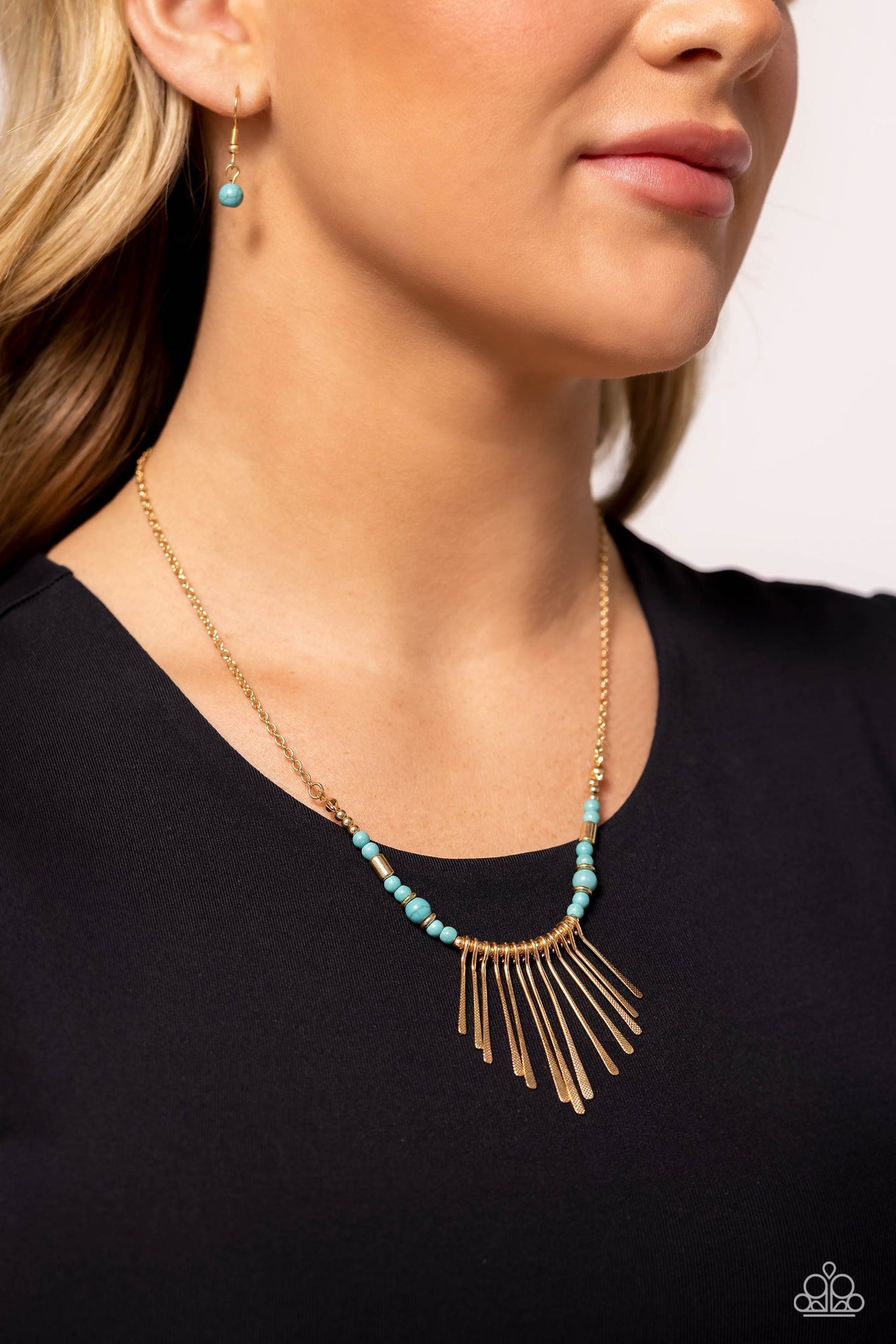Hammered in a dotted motif, a dainty row of gold rods shimmers along an invisible wire dotted in dainty gold and turquoise stone beads. Attached to a dainty gold chain, the tapered fringe flares out below the collar, resulting in an earthy edge. Features an adjustable clasp closure.