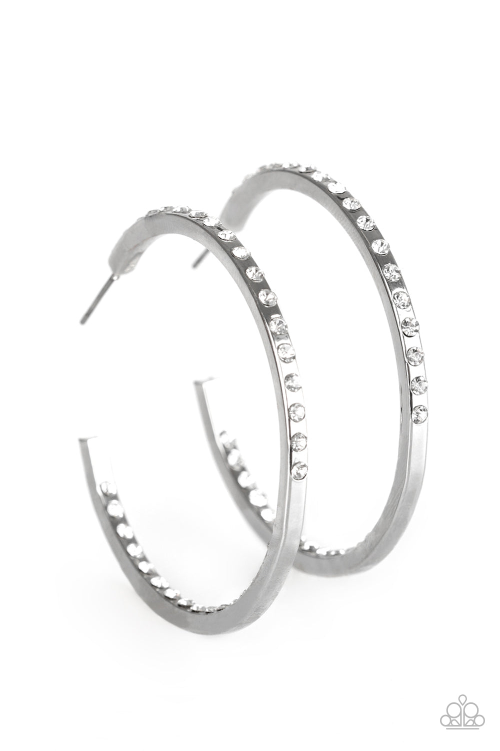The front half and inner backside of a sleek silver hoop is encrusted in glassy white rhinestones, easily catching and reflecting the light for an extra dash of shimmer. Earring attaches to a standard post fitting. Hoop measures approximately 2" in diameter.