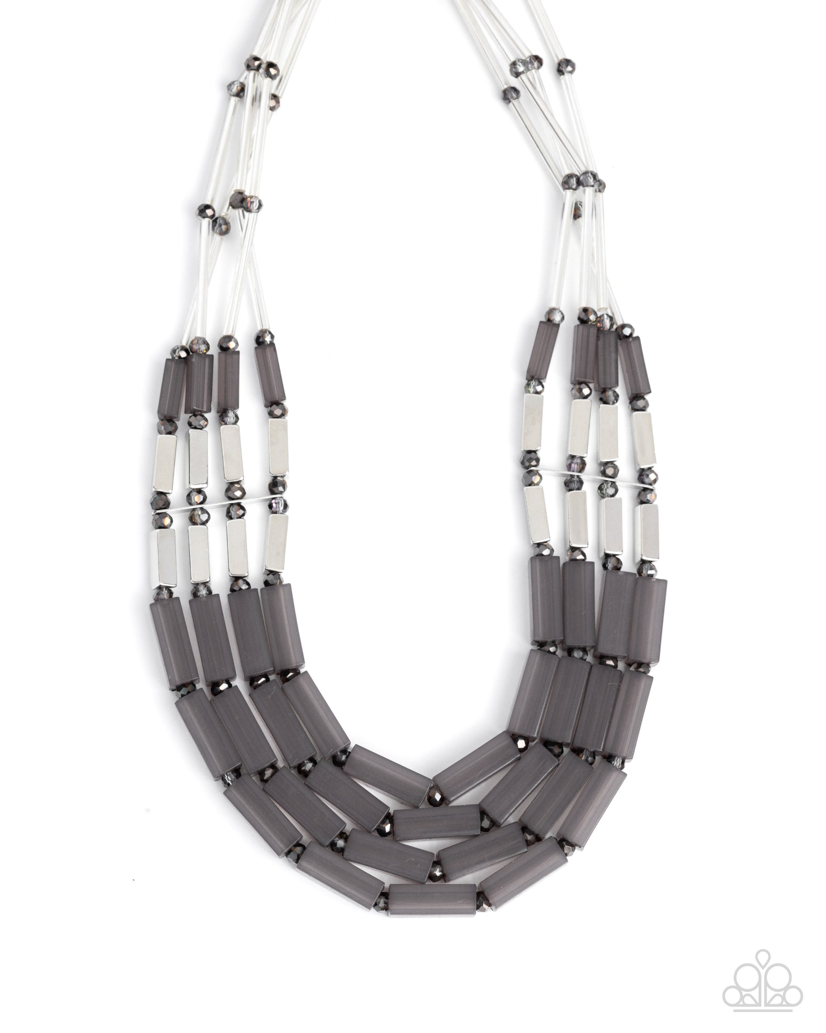 Featuring layers of bold gray acrylic beads that alternate with faceted oil spill hematite accents, a striking play of color and texture drapes below the neck. Sleek silver rectangular bars connect the strands, lending a touch of sophistication and structure to the design. Features an adjustable clasp closure.
