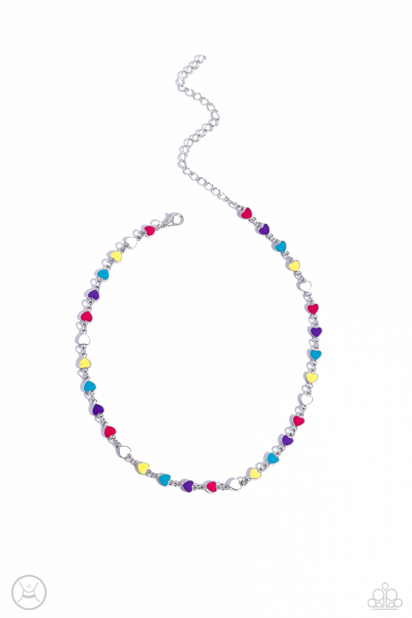 Multicolored-painted silver hearts interconnect around the collar for a simply sentimental look. Features an adjustable clasp closure.