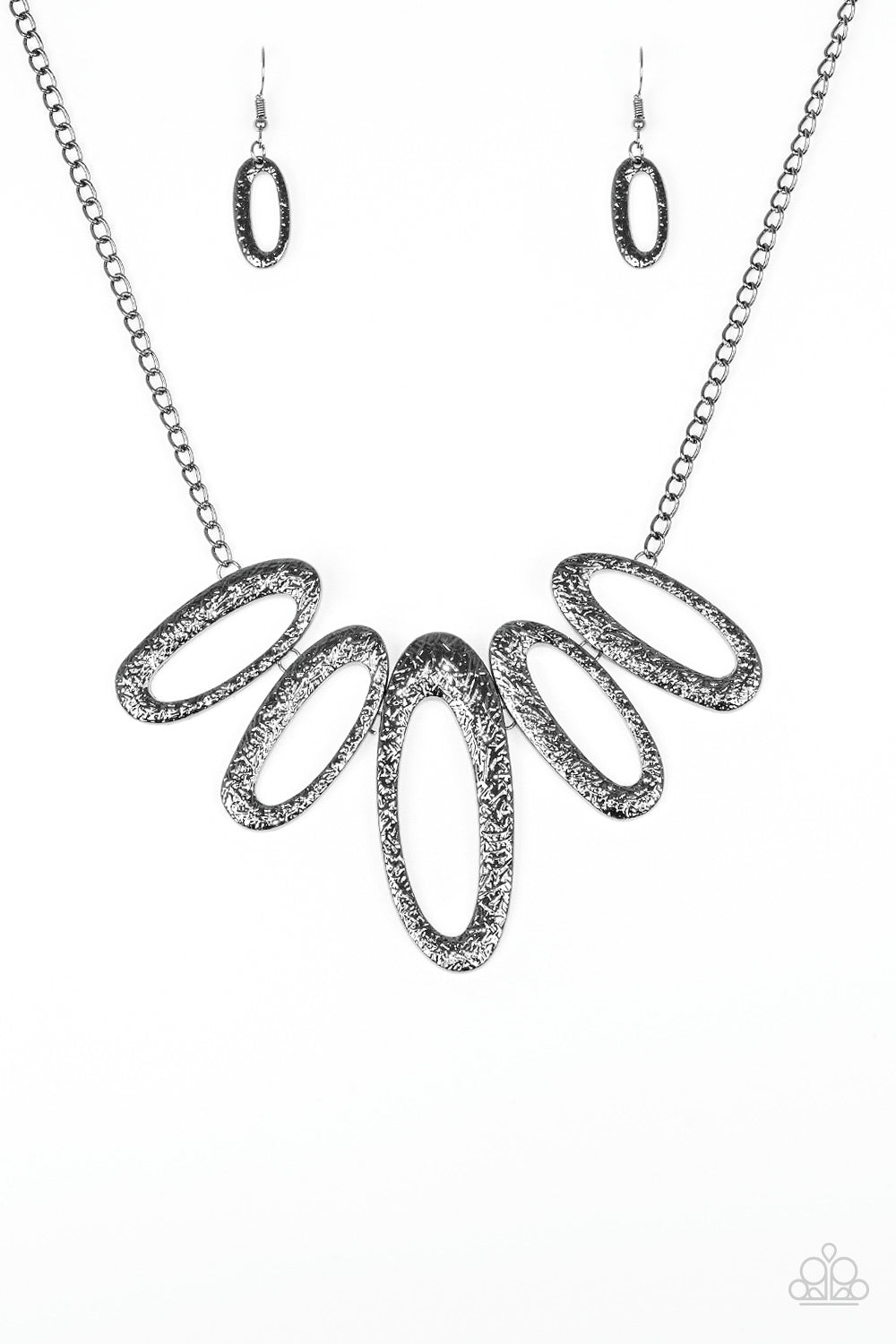 Embossed in radiating textures, asymmetrical gunmetal ovals link below the collar in a fierce fashion. Features an adjustable clasp closure.