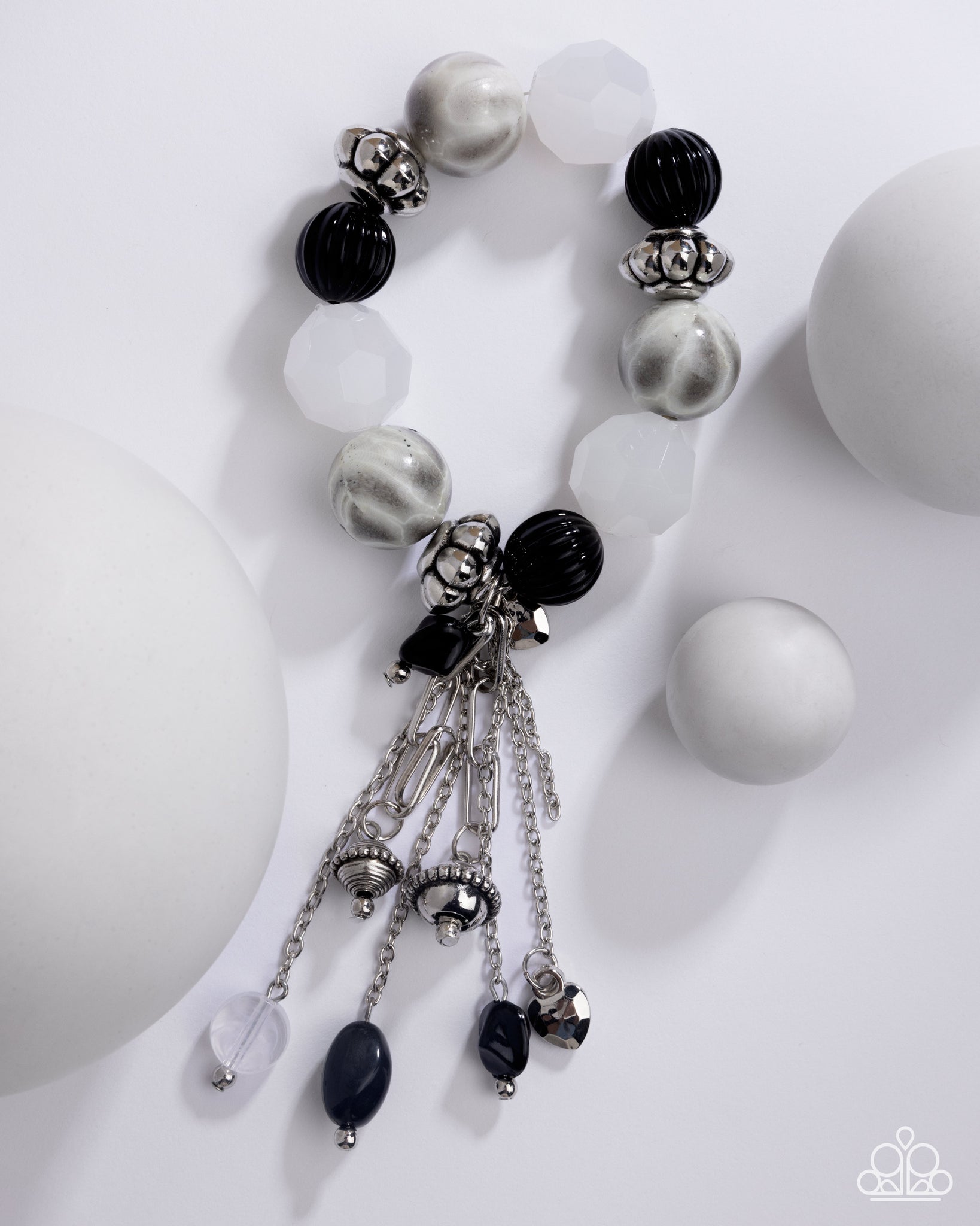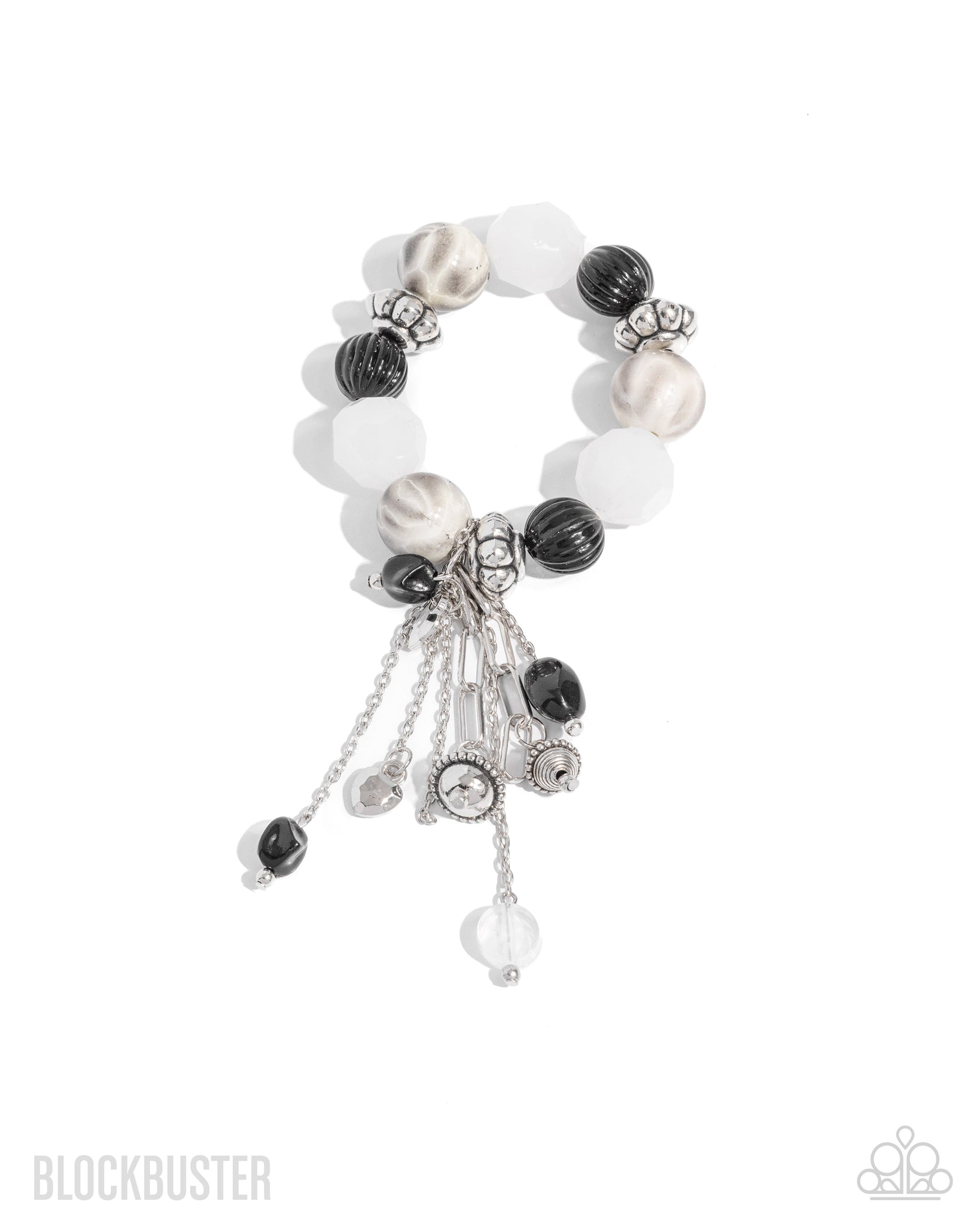 Infused along an elastic stretchy band, a collection of defaced milky white beads, textured silver beads, pleated linear-textured black beads, and abstract gray-striped beads loop around the wrist. A tassel of dainty and paperclip silver chains with daintier versions of the beaded bracelet at their ends swing, creating drama and additional visual interest.