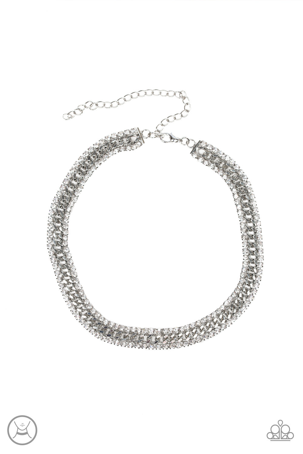 Featuring sleek square fittings, strands of glittery white rhinestones flank a glistening silver chain, coalescing into a regal look around the neck. Features an adjustable clasp closure.