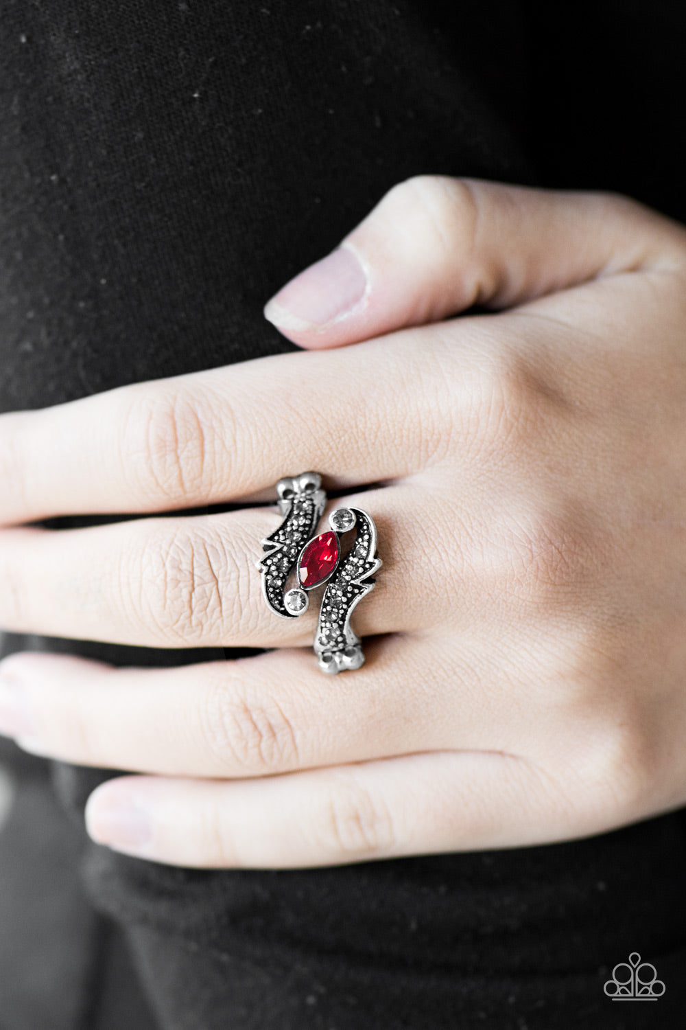 Encrusted in smoky rhinestones, textured silver bars curl around a glittery red rhinestone, creating a regal frame. Features a dainty stretchy band for a flexible fit.