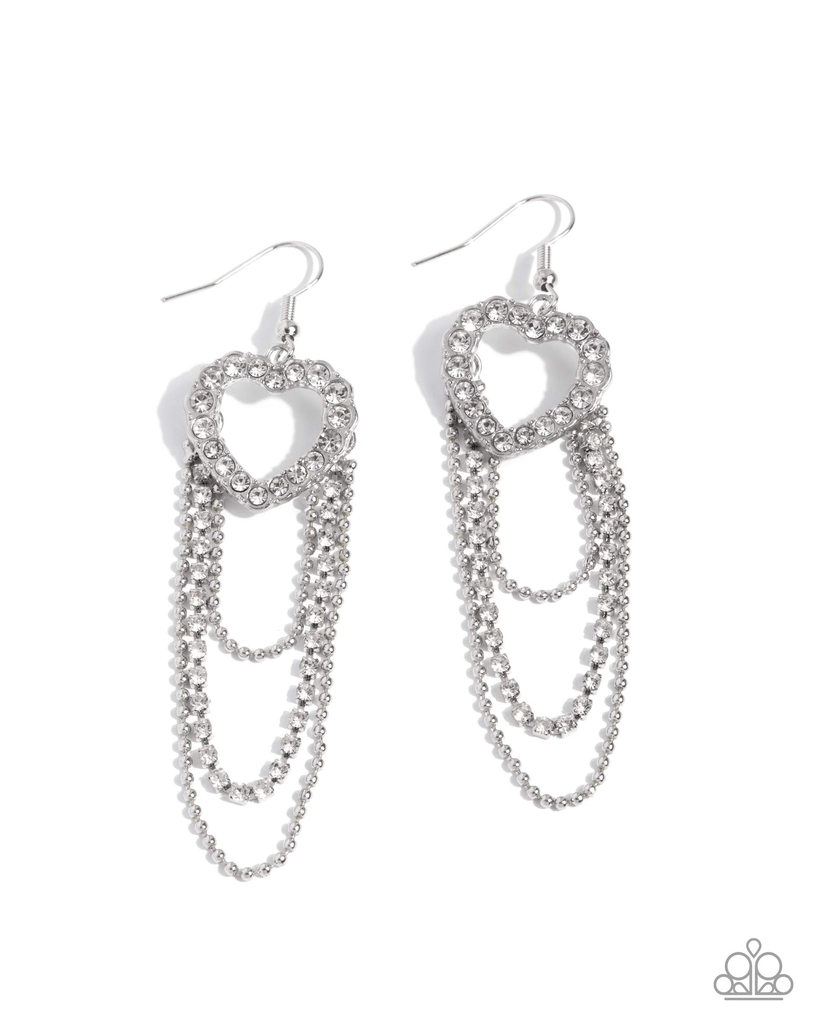 A glittery silver heart frame, encrusted in white rhinestones, swings from the ear as a trio of rhinestones and ball-chain strands cascade below. The layered chains glimmer with more white rhinestones creating a whimsical, romantic fringe. Earring attaches to a standard fishhook fitting.