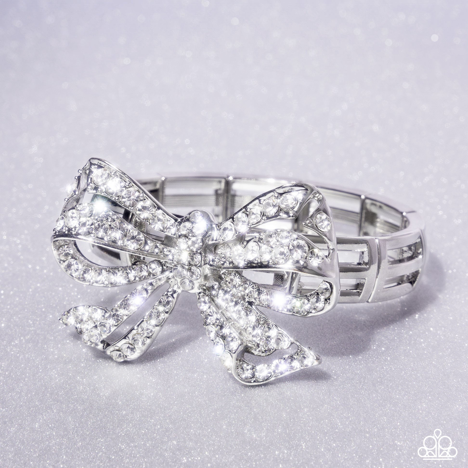 Infused along elastic stretchy bands, airy silver frames gleam along the wrist for a monochromatic display. Encrusted in white rhinestones, an oversized, airy silver bow glitters at the center of the design for a touch of class and refinement.
