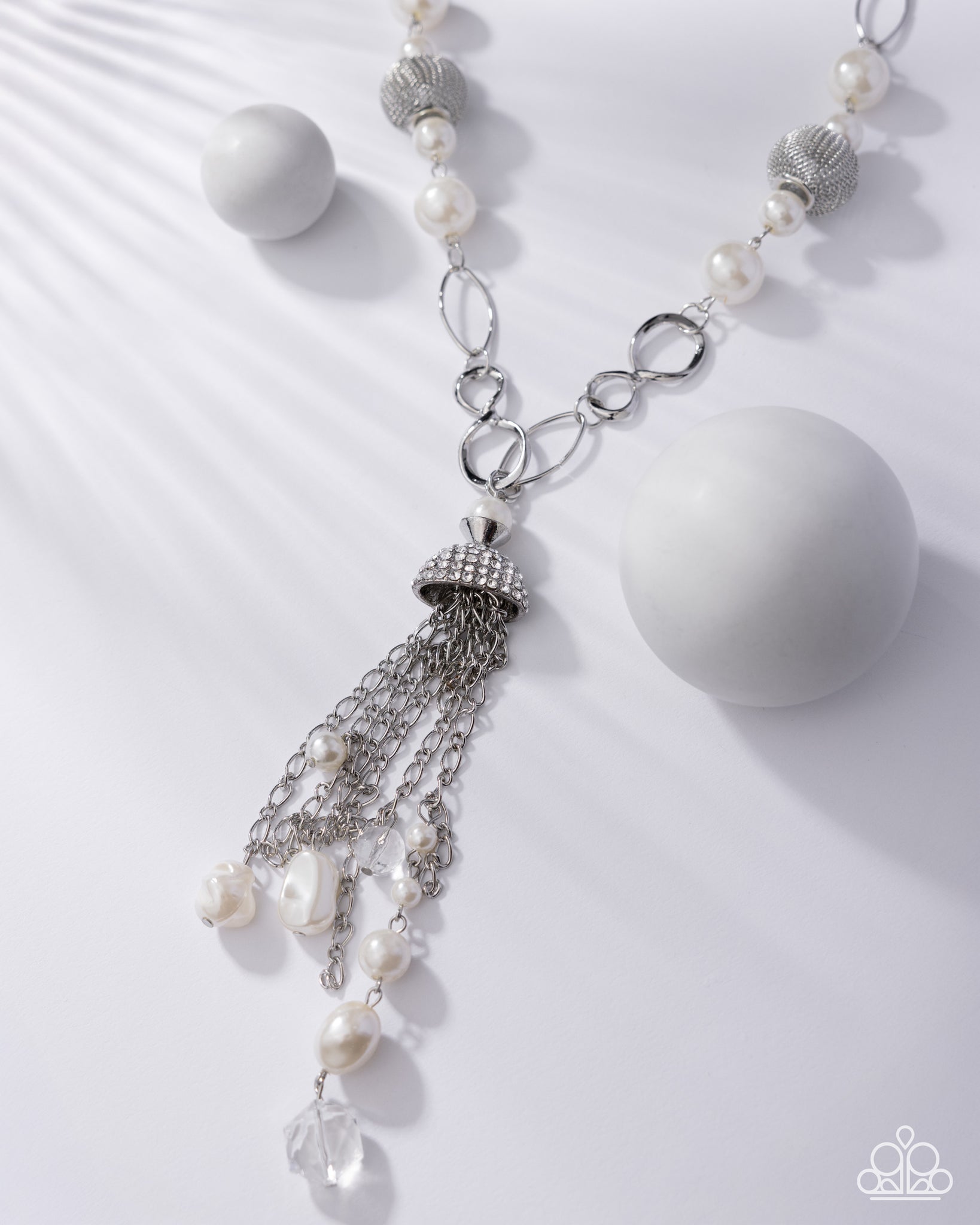 A half-shell studded in rhinestones overhangs a cluster of ivory pearls, tassels of silver chain, and small crystals. Two large wire mesh spheres and larger ivory pearls decorate the neckline.