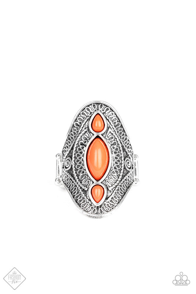 Teardrop and marquise shaped coral beads are pressed into the center of a thick silver frame embossed in swirling filigree detail for a tribal inspired look. Features a stretchy band for a flexible fit. Sold as one individual ring.