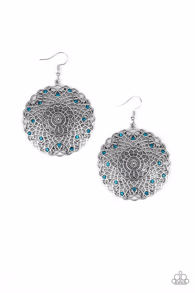 Featuring a flowery mandala-like pattern, a swirling silver frame is dotted with dainty blue rhinestones for a whimsical finish. Earring attaches to a standard fishhook fitting. Sold as one pair of earrings.