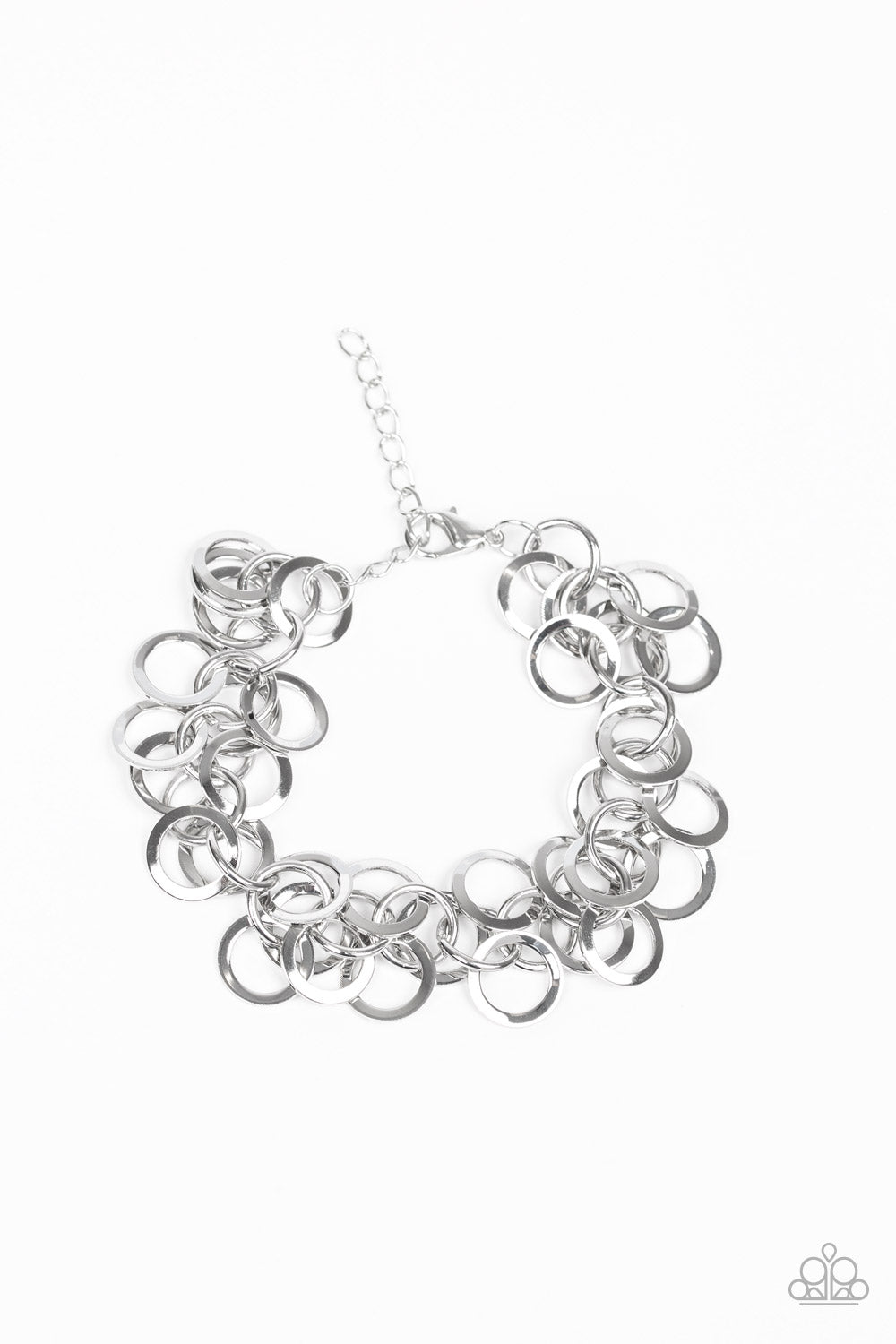Countless silver rings dangle from a shimmery silver chain, creating a noisy fringe around the wrist. Features an adjustable clasp closure.