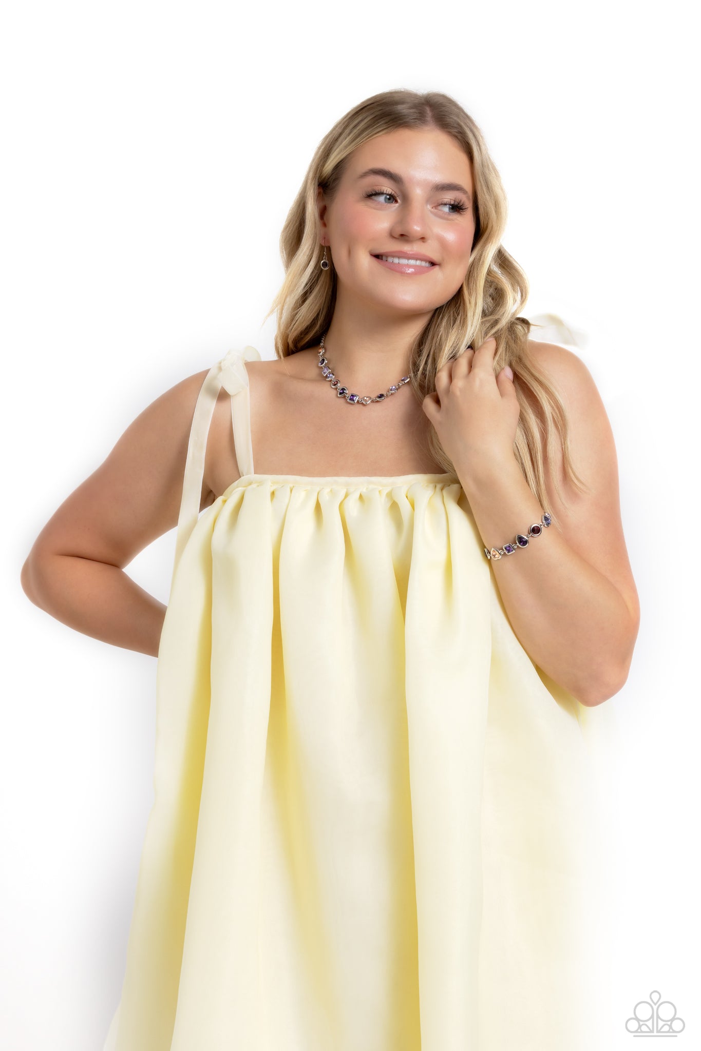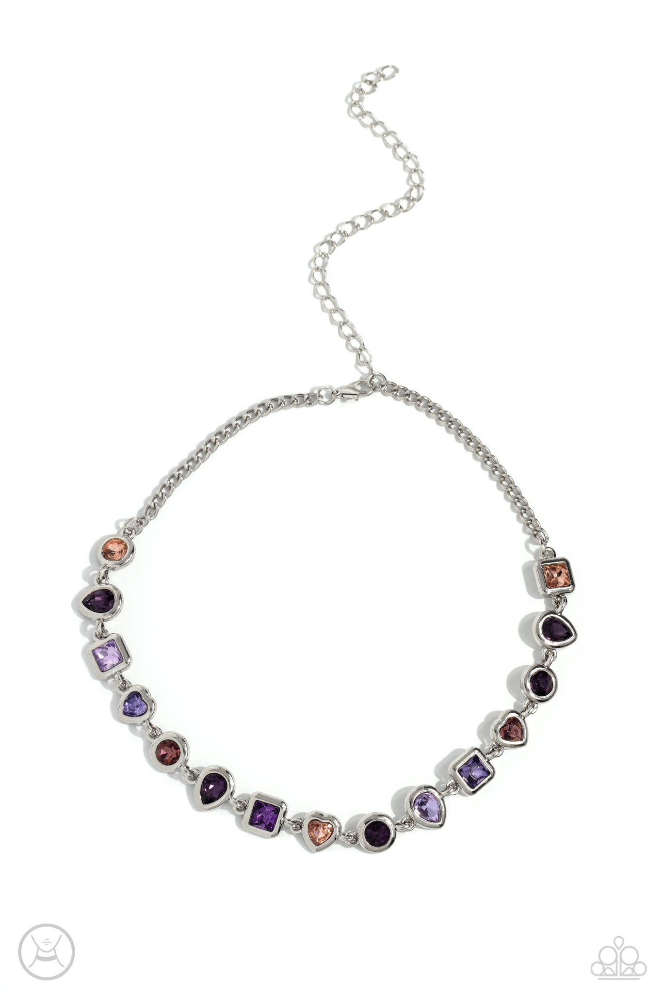 Necklace - Featuring various shapes and shades of purple, a collection of teardrop, round, heart, and square-cut gems in matching silver frames coalesce around the neckline for an abstract display of color and charm. Features an adjustable clasp closure.