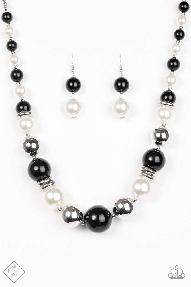 Gradually increasing in size towards the center, dramatic white pearls, polished black and shiny silver beads drape below the collar for a refined look. Glistening silver accents are sprinkled between the classic beads, adding depth and shimmer to the bubbly palette. Features an adjustable clasp closure. Sold as one individual necklace. Includes one pair of matching earrings.