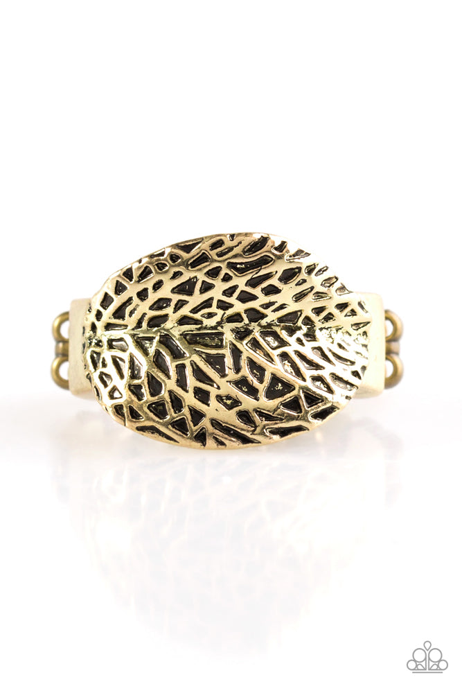 Brushed in an antiqued shimmer, a lifelike brass leaf curls across the finger in a seasonal fashion. Features a dainty stretchy band for a flexible fit. Sold as one individual ring.