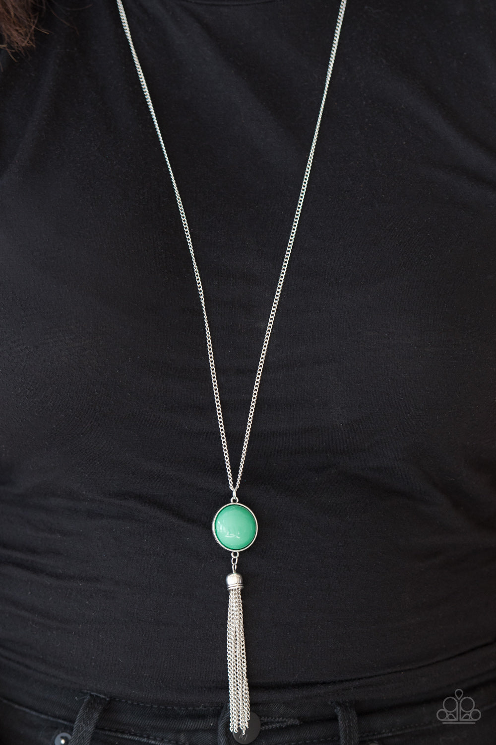 Swinging from the bottom of an elongated silver chain, a refreshing Arcadia bead gives way to a shimmery silver tassel for a bold pop of color. Features an adjustable clasp closure.