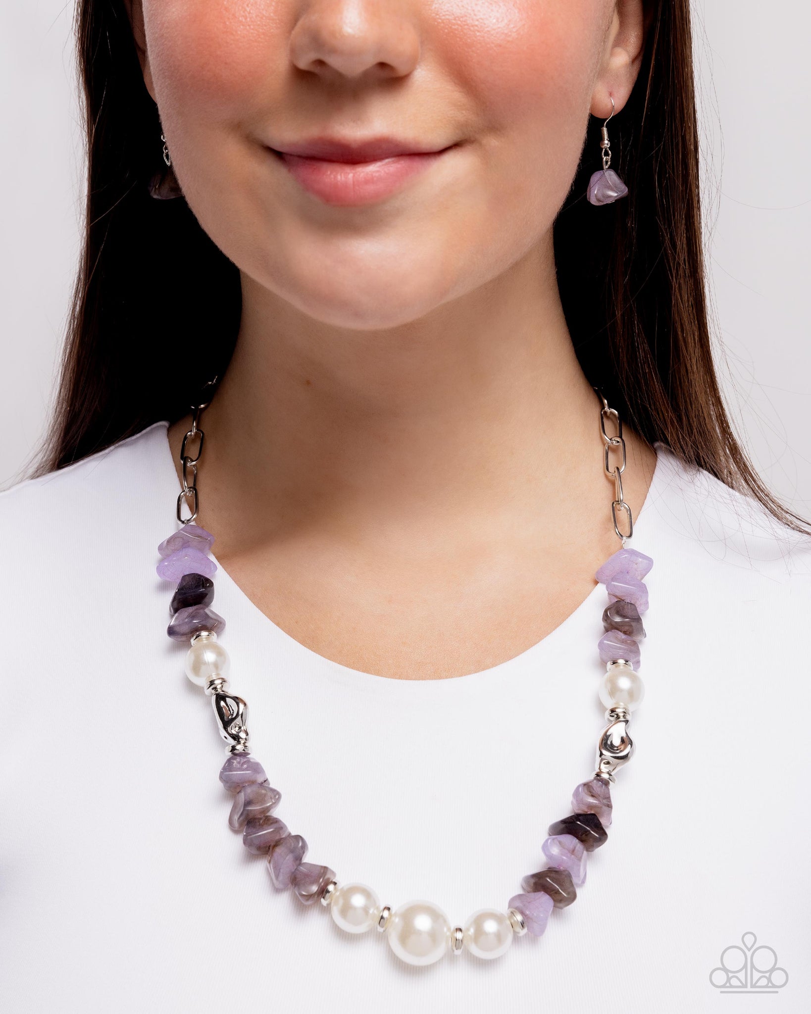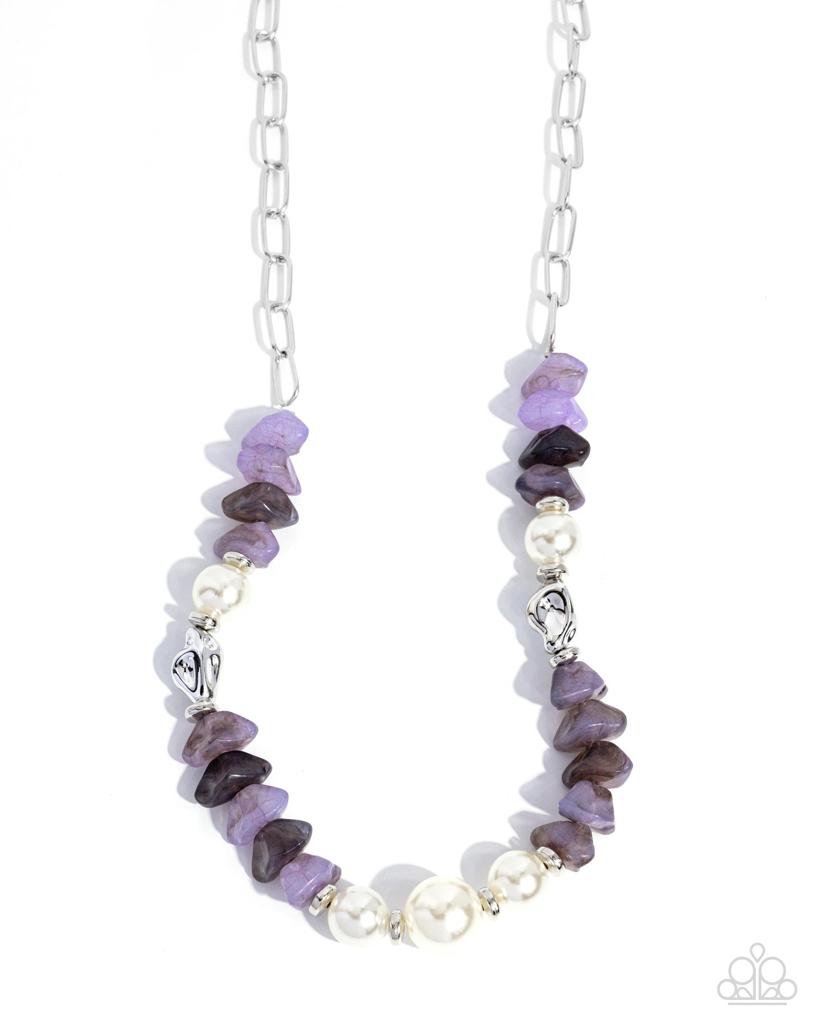 Connecting along a silver paperclip chain, a collection of chiseled amethyst stones, silver discs, shimmery white pearls in varying sizes, and vertical-facing chiseled silver beads pattern and coalesce below the neckline for a dynamically dignified display. Features an adjustable clasp closure. As the stone elements in this piece are natural, some color variation is normal.
