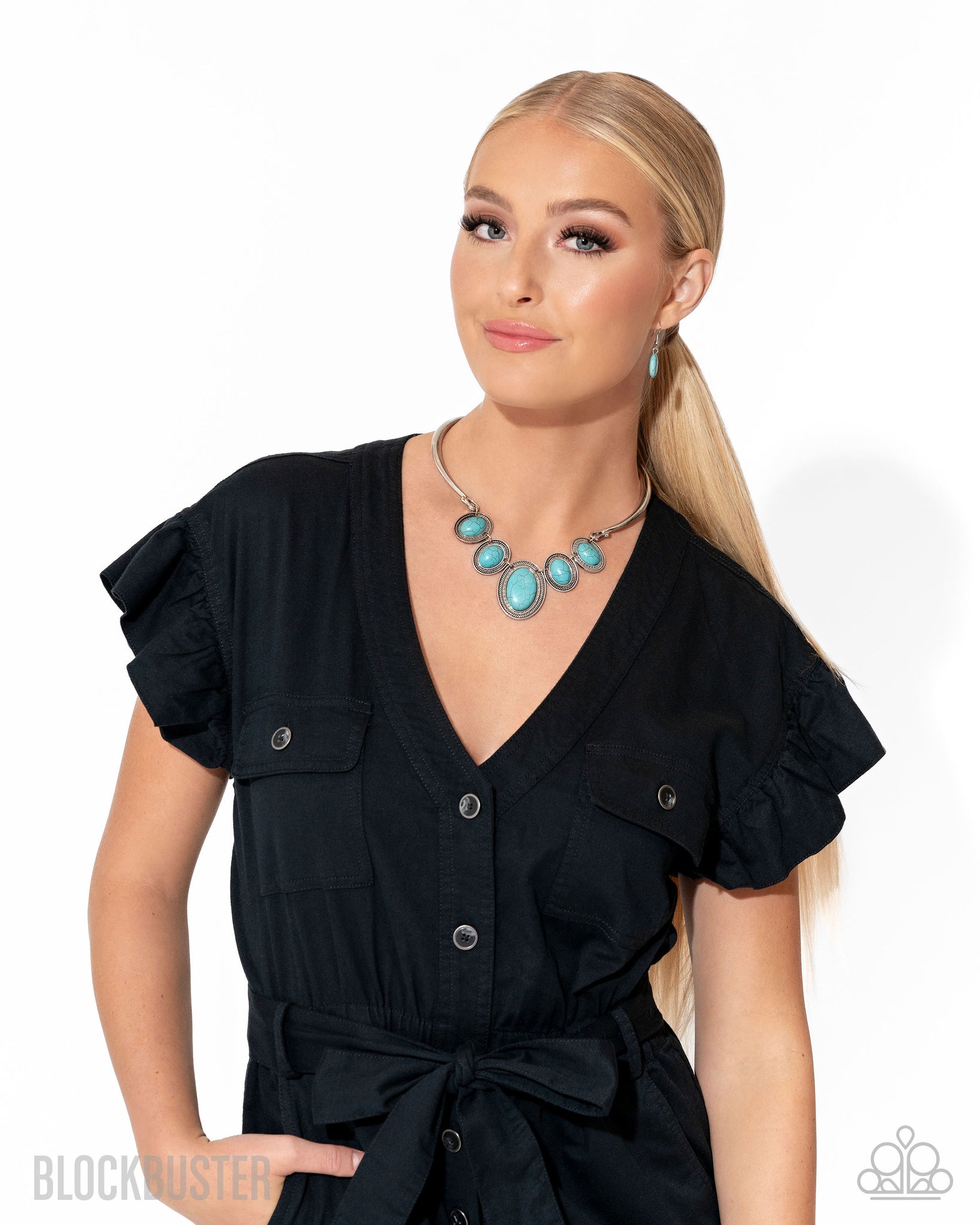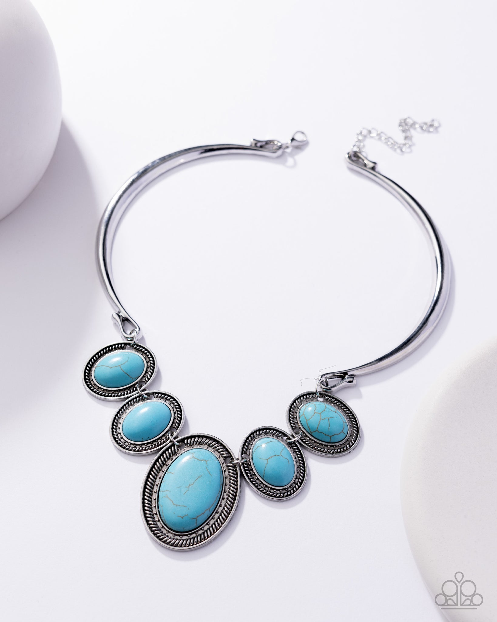 Two antiqued silver bars curl around the neck as they give way to a row of refreshing turquoise stones that falls delicately below the collar. Each stone is encased in a textured silver frame, adding a traditional artisanal flair to each unique pendant. Features an adjustable clasp closure.