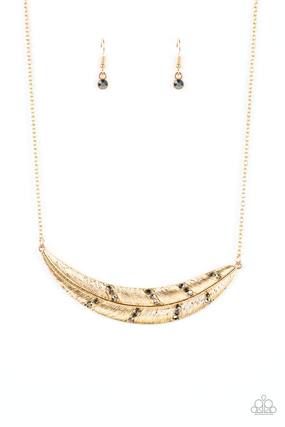 Dotted in sections of glittery hematite rhinestones, a lifelike gold feather pendant is suspended horizontally below the collar for a seasonal look. Features an adjustable clasp closure.