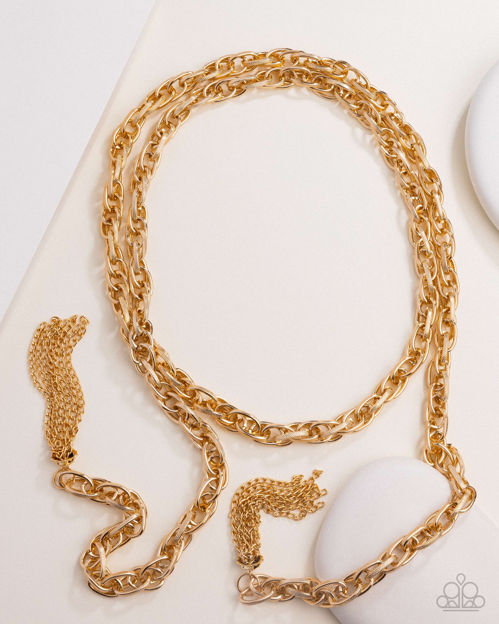 A lengthened strand of spiraling, interlocking abstract gold links, with light-catching texture, wraps around the neck, creating a layered choker-inspired necklace. Two tassels of classic gold chains cascade from both ends of the chain, adding dramatic length and versatility to the way the piece can be worn.