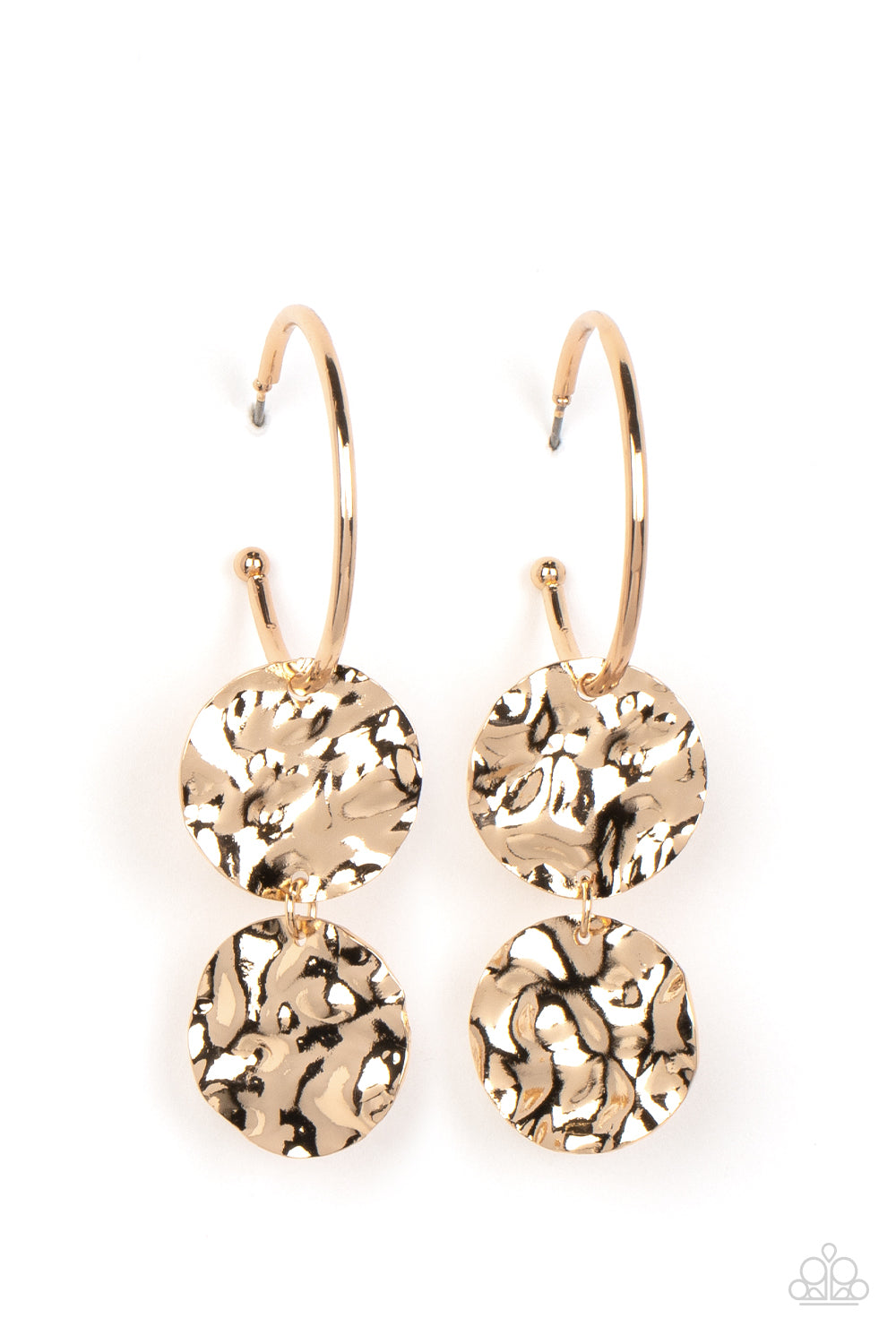 A linked pair of hammered gold discs glides along a classic gold hoop, adding an edgy twist to the timeless look. Earring attaches to a standard post fitting. Hoop measures approximately 1 1/4" in diameter.