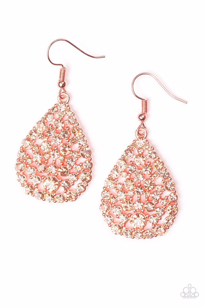 Varying in size, bubbly peach rhinestones coalesce into a blinding shiny copper teardrop for a dramatic fashion. Earring attaches to a standard fishhook fitting. Sold as one pair of earrings.