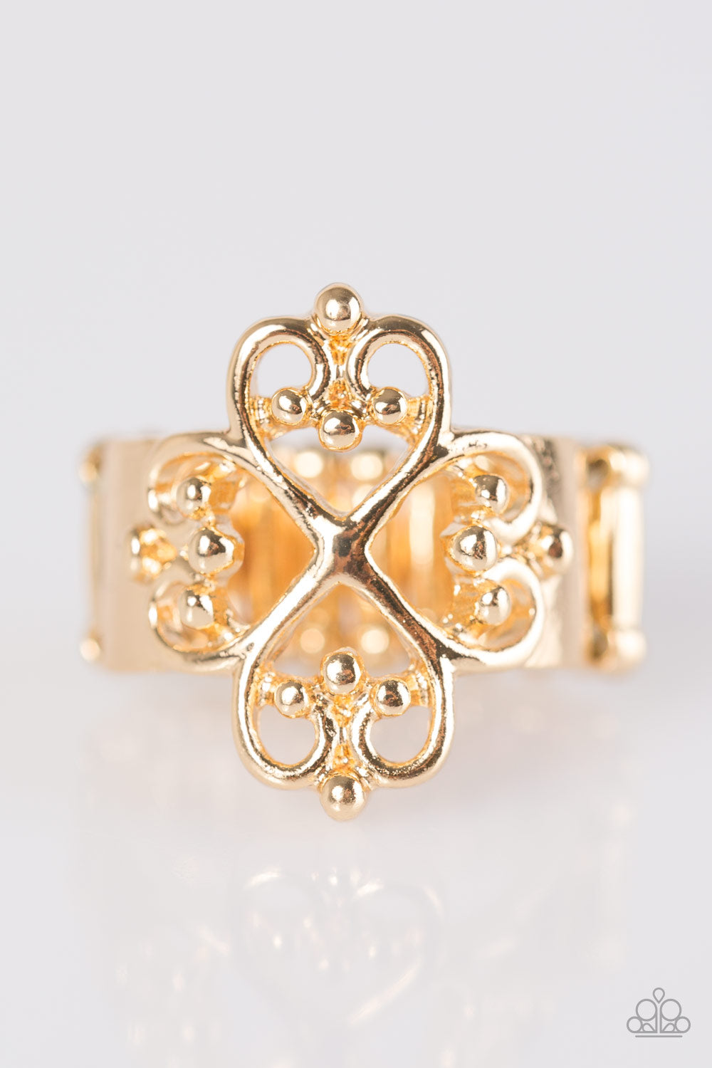 Brushed in a high-matte sheen, glistening gold bars swirl atop the finger, creating a regal filigree filled frame. Features a stretchy band for a flexible fit.