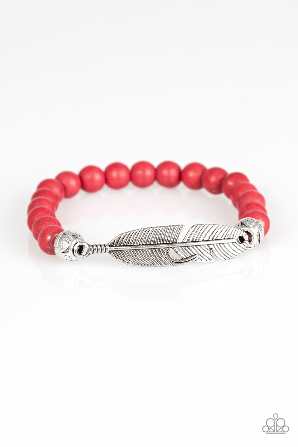 Fiery red stone beads are threaded along a stretchy elastic band. Infused with a pair of ornate silver beads, a lifelike silver feather charm adorns the center of the strand for a wanderlust finish.