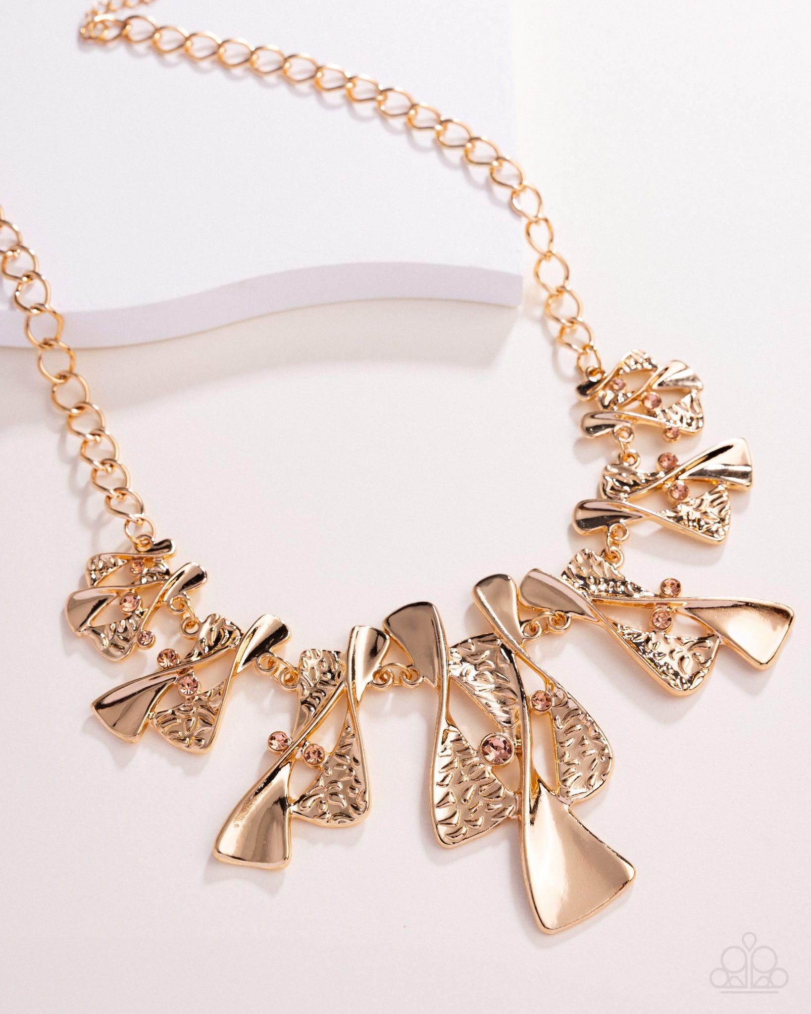 Embellished along a chunky gold chain, twisted hourglass-like shapes, half hammered in texture gradually increase in size as they get to the center of the design for an elegantly esteemed look. Dainty light peach rhinestones are randomly interspersed along the shapes, adding dazzling depth to the design. Features an adjustable clasp closure.