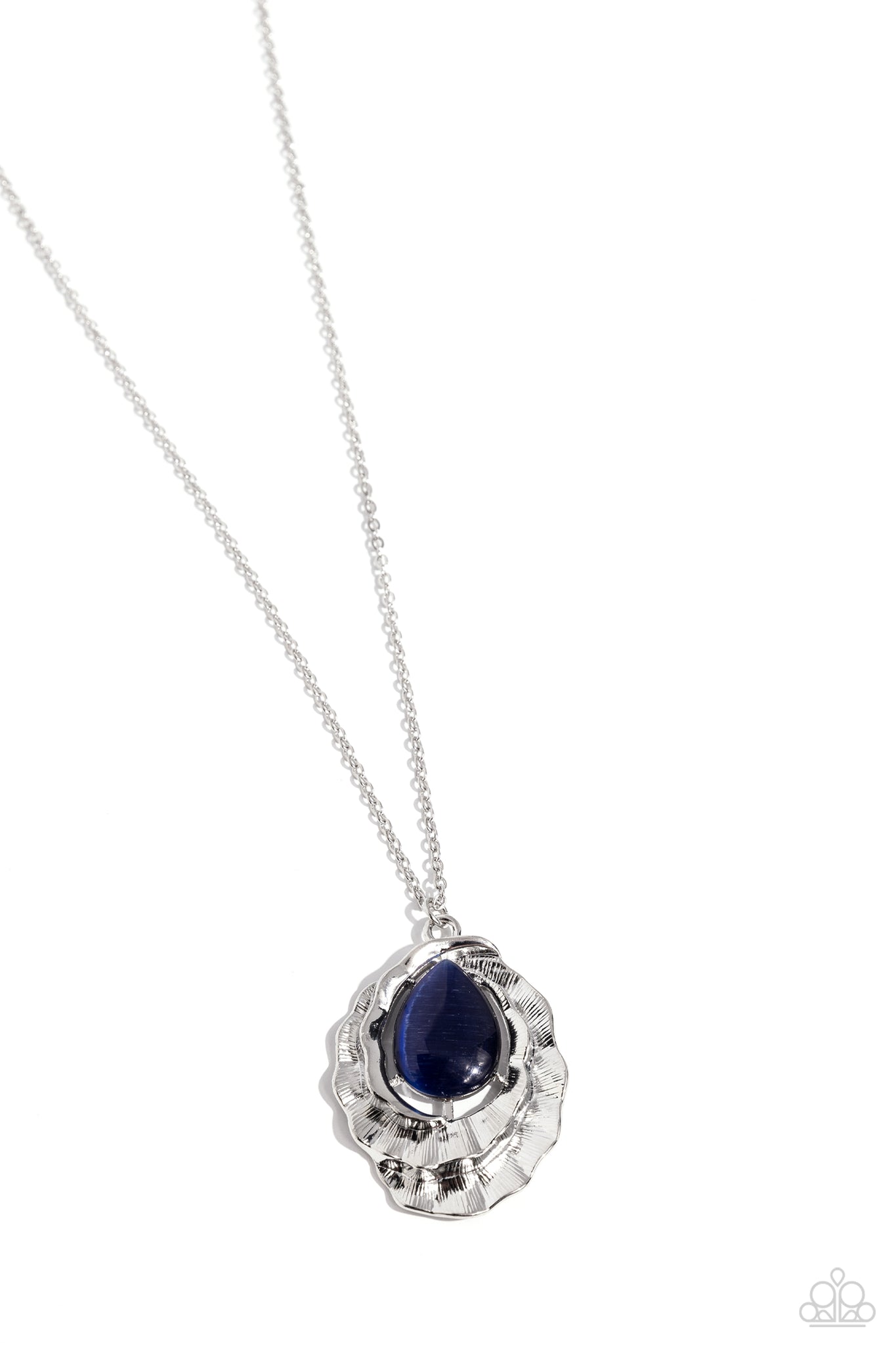 Rippling folds of scalloped silver frames gently gather around a blue teardrop cat's eye stone, creating an ethereal pendant at the bottom of an elegantly extended silver chain. Features an adjustable clasp closure.