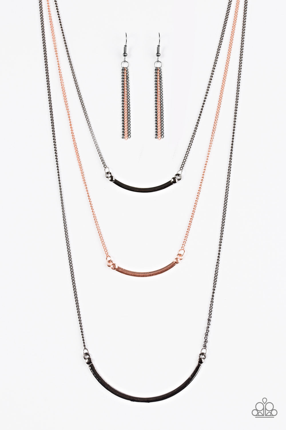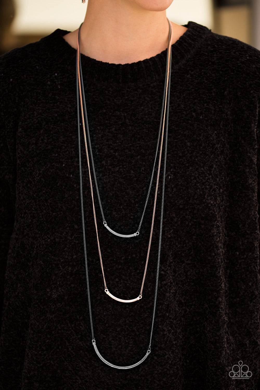 Shiny copper and glistening gunmetal chain alternate down the chest, creating mixed metallic layers. Varying in size, shiny copper and gunmetal crescent shaped frames swing from coordinating chains for a bold industrial finish. Features an adjustable clasp closure.