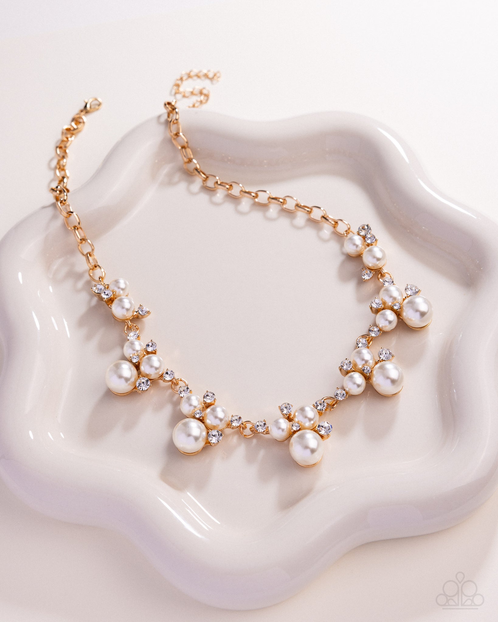 Nestled in gold-pronged fittings, clusters of glossy white pearls and dazzling white rhinestones join below the collar, creating refined frames. Infused with a glistening gold cable chain, the sections of ladylike luminescent frames timelessly trickle along the neckline. Features an adjustable clasp closure.