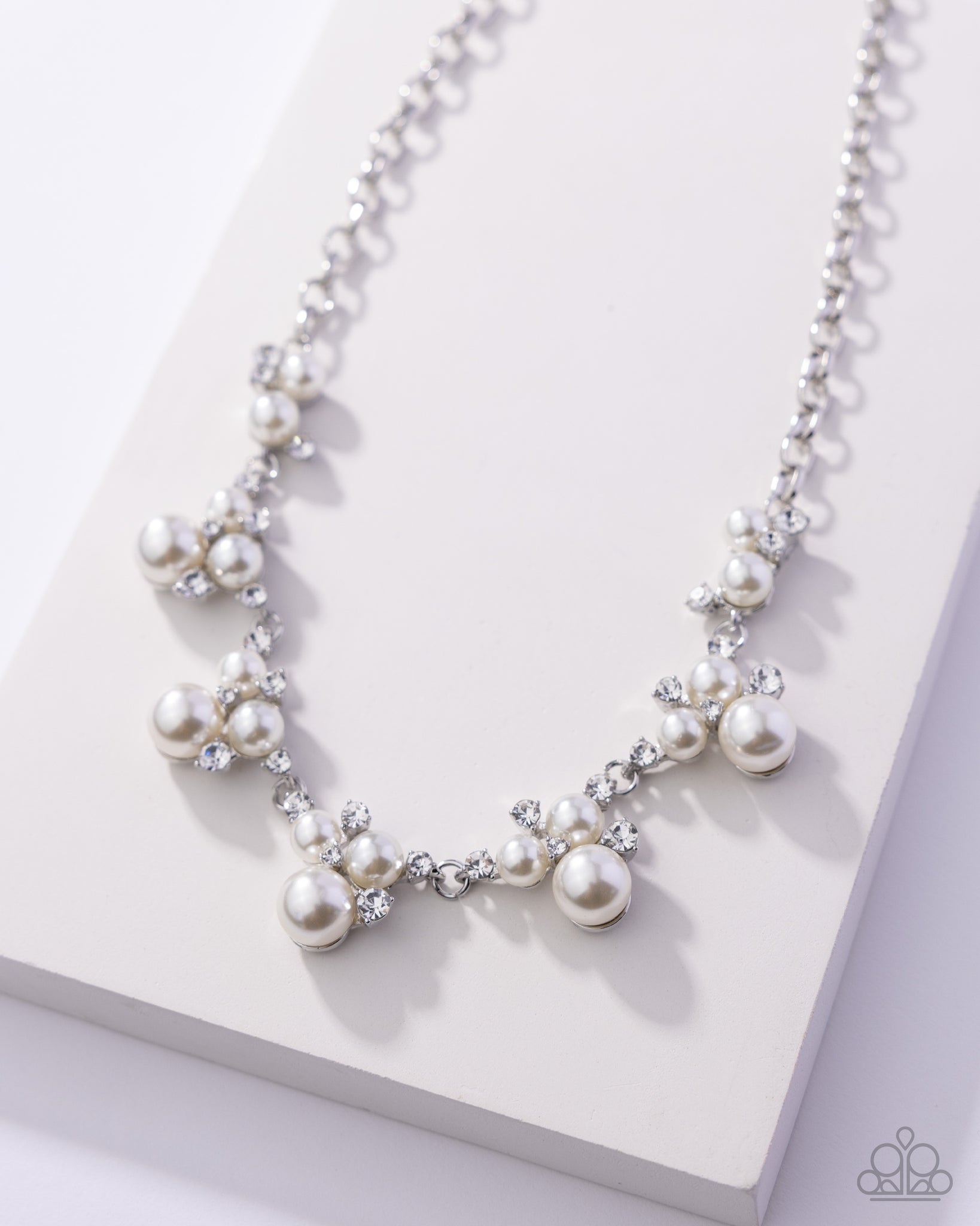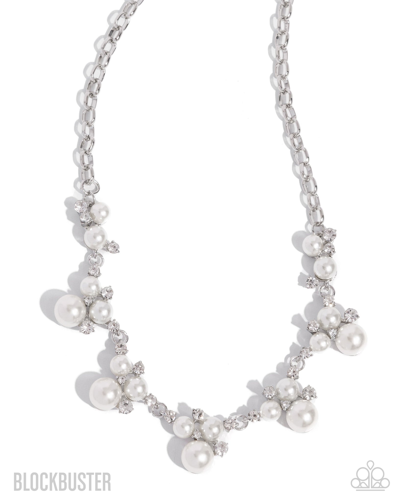 Nestled in silver-pronged fittings, clusters of glossy white pearls and dazzling white rhinestones join below the collar, creating refined frames. Infused with a glistening silver cable chain, the sections of ladylike luminescent frames timelessly trickle along the neckline. Features an adjustable clasp closure.
