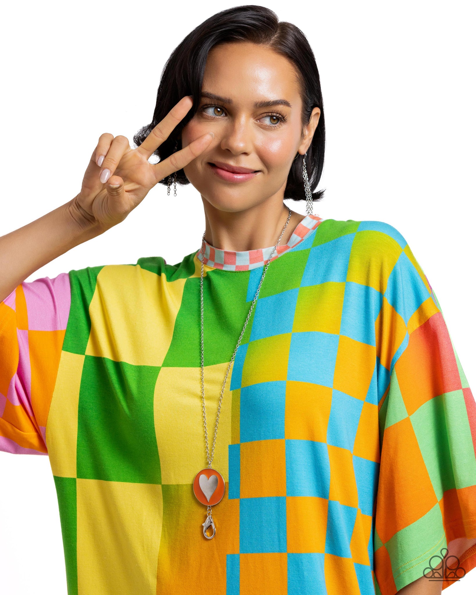 Embossed with a silver heart, an orange-painted pendant bursts from the center of an elongated silver chain below the collar for a pop of romantic color. A lobster clasp hangs from the bottom of the design to allow a name badge or other item to be attached. Features an adjustable clasp closure.
