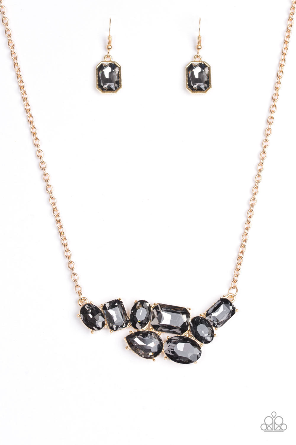 Featuring regal teardrop, oval, and emerald style cuts, smoky gems coalesce into a glittery asymmetrical pendant below the collar, creating a knockout pendant. Features an adjustable clasp closure.