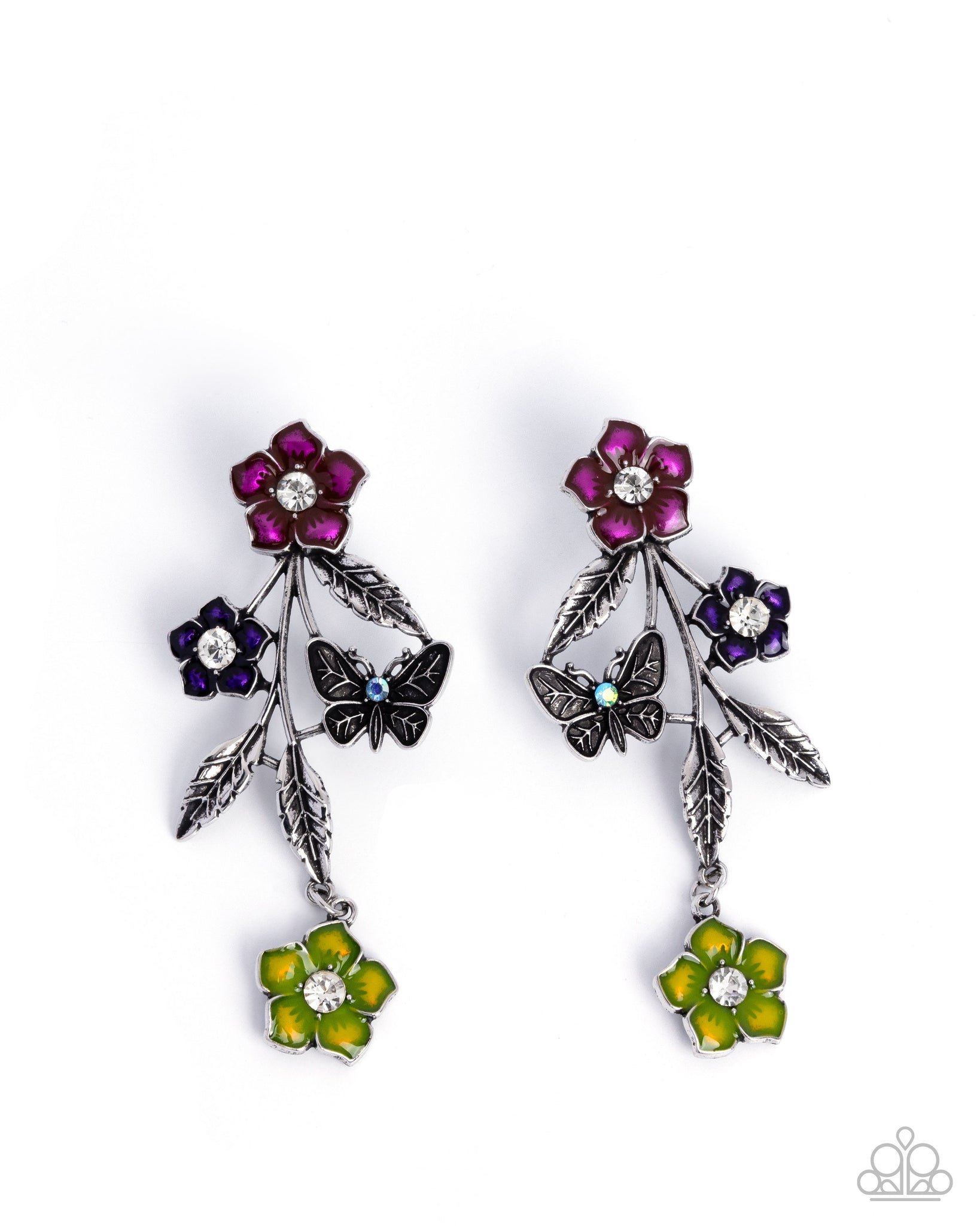 Featuring white rhinestone centers, varying transparent Pink Peacock and Purple-painted silver flowers bloom atop the ear giving way to textured silver leaves and whimsical silver butterflies with aquamarine iridescent bodies and a solitaire additional yellow flower, swaying below the ear for an eye-catching eclectic lure. Earring attaches to a standard post fitting. Due to its prismatic palette, color may vary.
