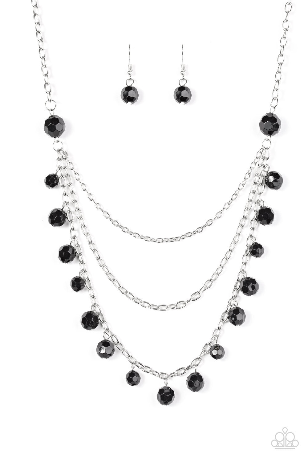 Varying in size, faceted black beads trickle along the lowermost silver chain, creating a glamorous fringe below the collar. Two dainty silver chains are draped above the colorful fringe for a refined finish. Features an adjustable clasp closure.